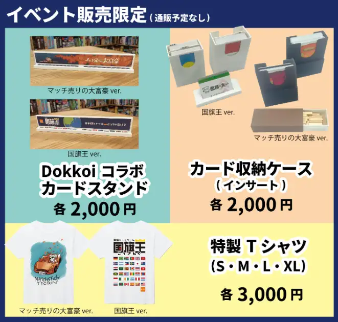 を、それぞれ『国旗王』ver.と『マッチ売りの大富豪』ver.で用意しました。どれも質には自信があるので、ぜひブースで実物を触って確かめてほしいです。