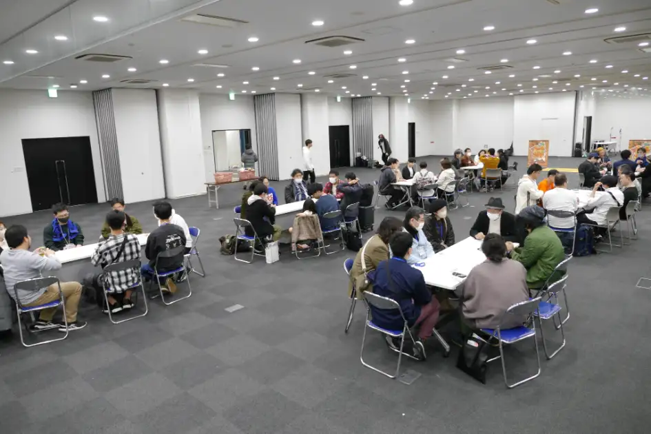 3月30日、朝11時の開場。名古屋駅から徒歩5分のウインクあいち8階展示場は、開場前からチケットを手にしたボードゲームファンの皆さんで大賑わいです。