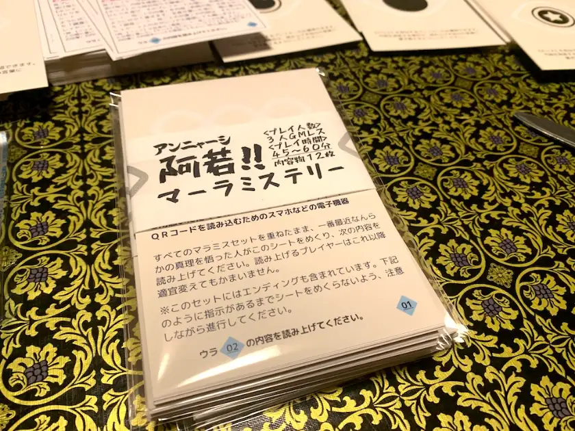 - アンニャーシ!マーラミステリーつき(3人GMレスミステリーゲームと、協力数字当てゲームのお題がたくさん)