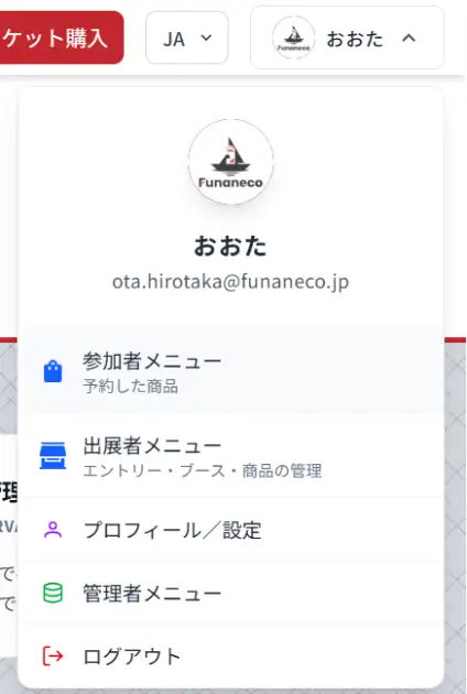 ご自身のアカウントメニューから【出展者メニュー】を開くとアクセスできます。