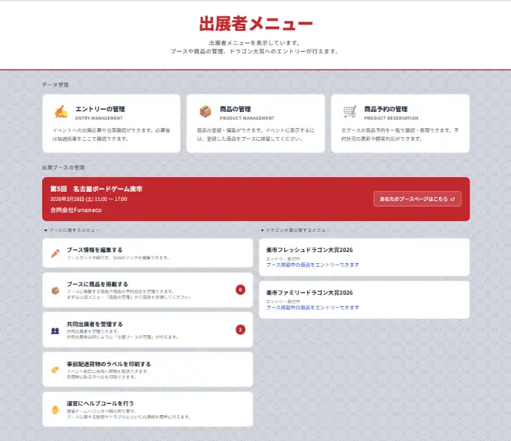 名古屋ボードゲーム楽市のホームページにログインいただき、
