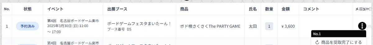 ③ブースに商品を掲載するで予約を設定し、その商品に予約が入ると一覧に表示されます。