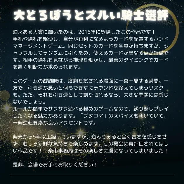 「大どろうぼうとズルい騎士」は、誰がいつ遊んでも楽しめる普遍性があり、つい「もう一度」と言ってしますリプレイ性が高く評価されました。