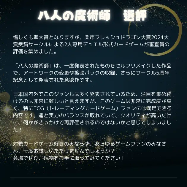 惜しくも準大賞となりますが、楽市フレッシュドラゴン大賞2024大賞受賞サークルによる2人専用デュエル形式カードゲームが審査員の評価を集めました。