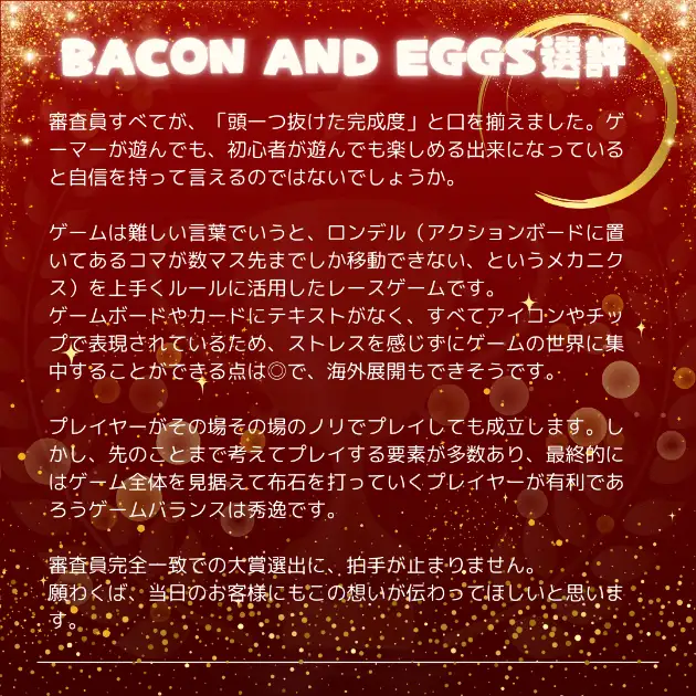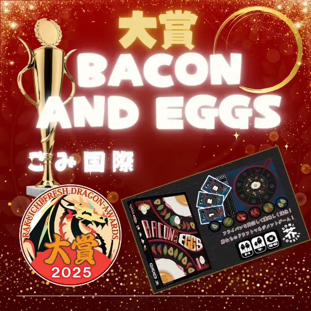 大賞の「BACON」は確実に跳ねるゲームとして、2025年のボードゲーム界で存在感を発揮するのではないでしょうか? その日が楽しみです!