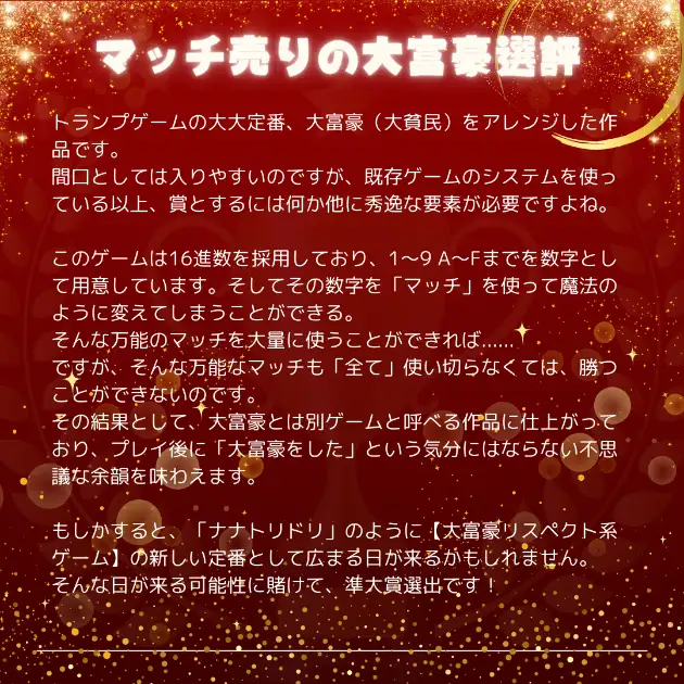 準大賞の2作品「マッチ売り」と「ホースマジュール」はそれぞれ軽量級ですが、それだけに無駄の省かれたゲームデザインが秀逸でした。