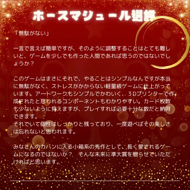 心理戦を楽しむ作品はこれまでも数多く発表されてきましたが、この作品には新たな可能性を感じます。ゲーム展開の強弱や脱落といった要素を上手く昇華させ、むしろゲームの魅力として引き出しているように感じました。この作品が定番作品の牙城を崩すかもしれない期待感さえ抱けます。あとは多くの人々が手に取り、遊ぶ準備を進めるだけだと思います。