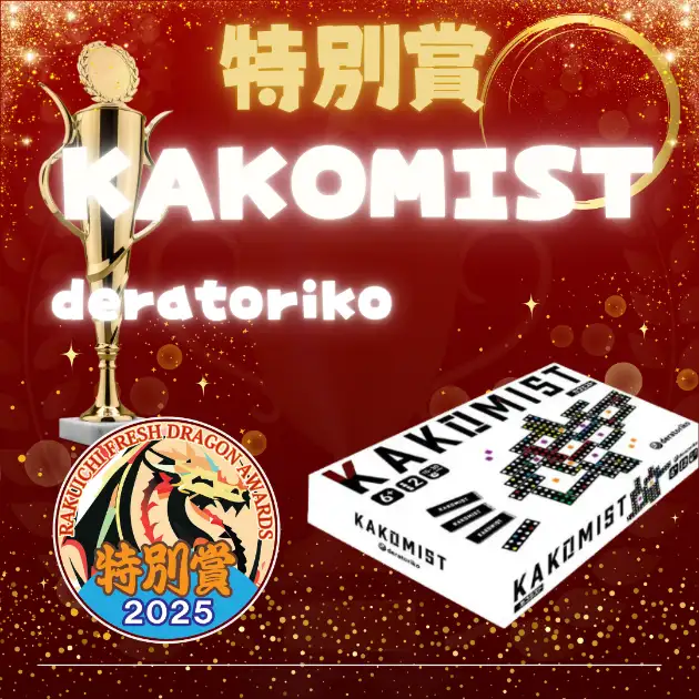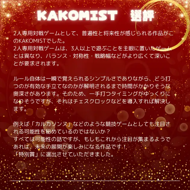 特別賞「kakomist」は新しい2人用ゲームとしての可能性を感じました。このゲームの評価はより目の肥えたファンに下していただきたいです。