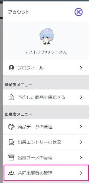 ① 右上のアカウントメニュー画面から「共同出展者の管理」を選択します。