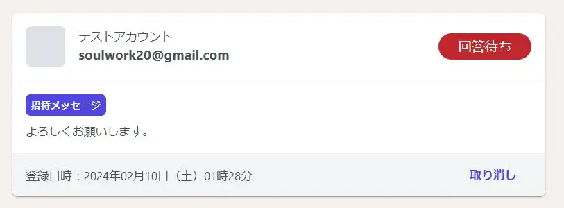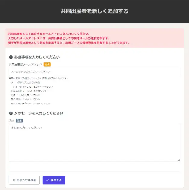 これにて、共同出展者の招待は完了となります。入力した共同出展者メールアドレス宛に通知が送信されていますので、招待を受け取ったアカウントから確認してください。