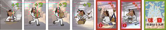 『+1、+2、+3、サボり、休日』の5種類の労働カードから毎日1枚ずつ場に出します。