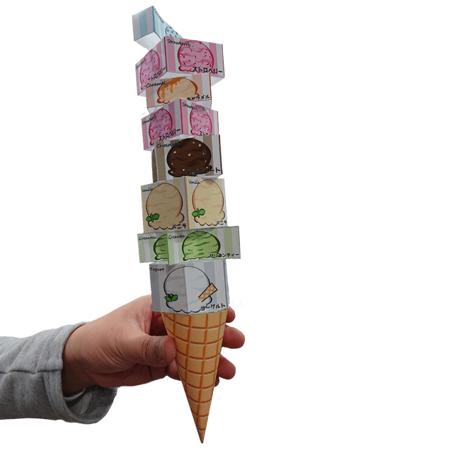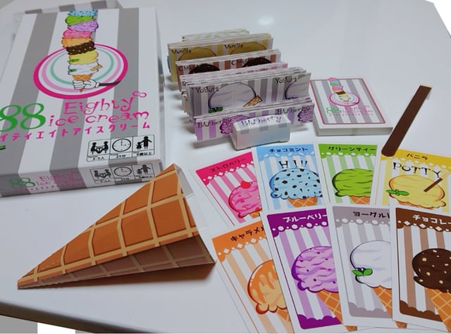 注文カードの指示に従い、アイスクリームをどんどん積み上げていきます。nアイスクリームが崩れてしまったら、その時点までにめくられていたカードを引き取りそれが失点となります。n
