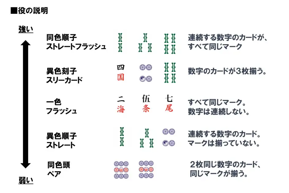 場に3枚のカードで役を作り、先に4勝したら勝利