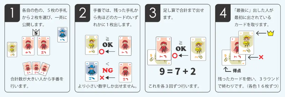 一斉にカードを出して、遊ぶカードゲームですが、それよりも相手の手札をそこから推理するのが楽しいゲームです。