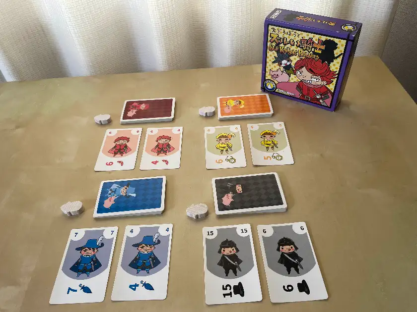 ゲームは、最初に各自で出す2枚のカードの取り合いです。これを得点カードと呼びます。
