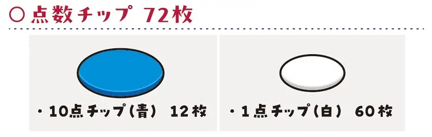 本ゲームは、基本カード75枚と点数チップを使って遊びます。