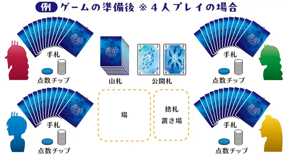 その後、残ったカードから2枚を表にして公開札とし、さらに残ったカードを山札とします。