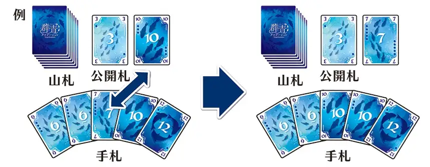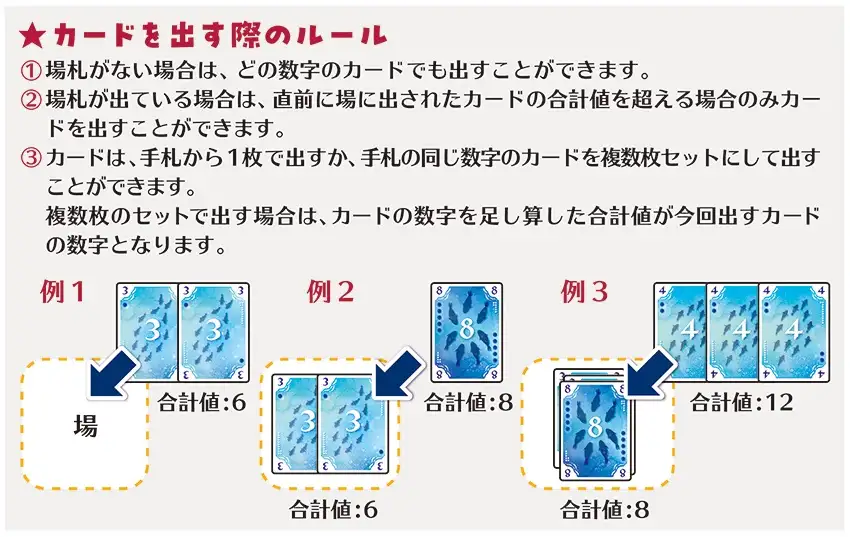 場のサカナ(カード)より数字が大きければ、サカナを場に出せます。