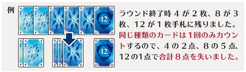 カードを出し切れなかったプレイヤーは、残っている自分の手札を確認します。