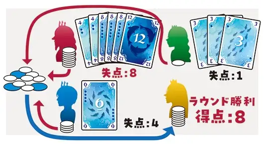 ただし、エサを食べられず手札に残ったサカナたちは減点になってしまうので気を付けて!