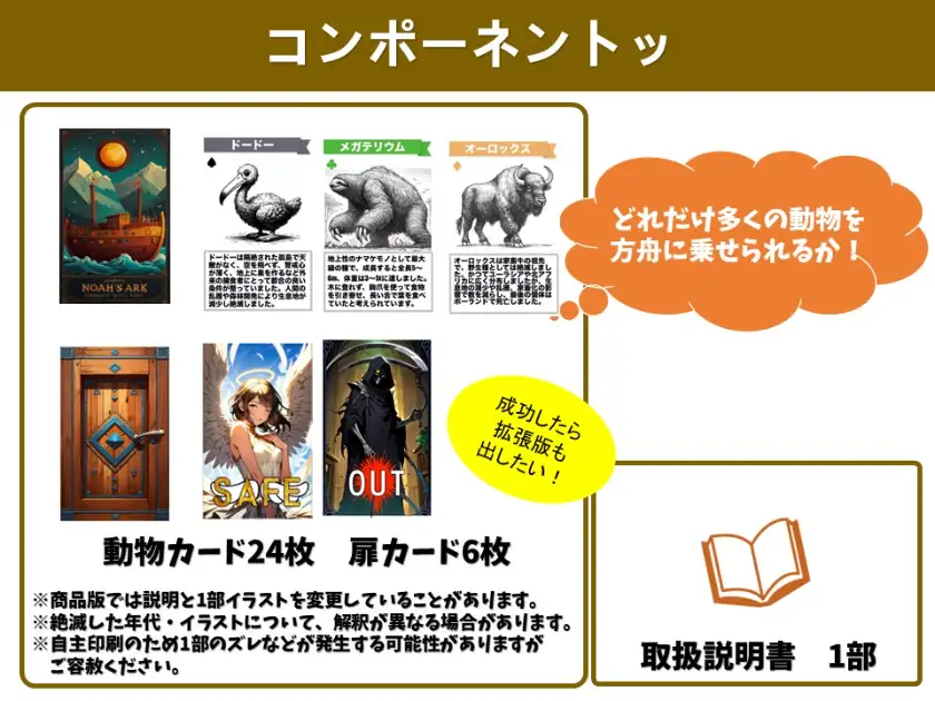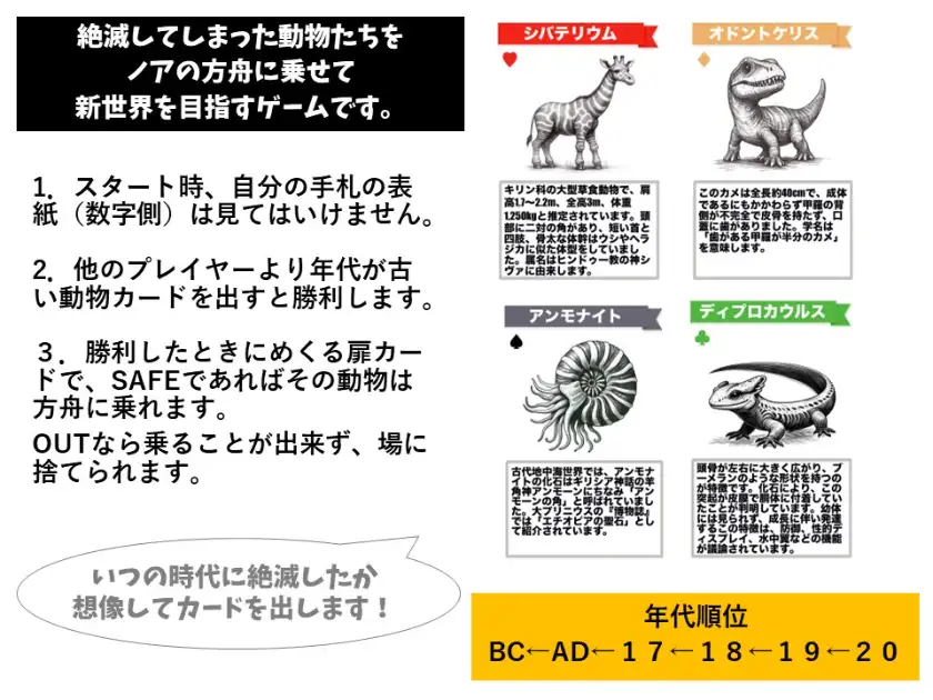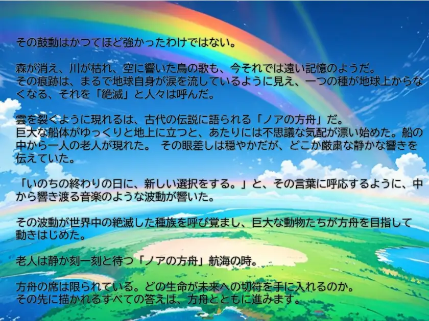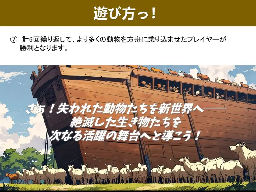 絶滅してしまった動物たちをノアの方舟に乗せて、新世界を目指すゲームです。