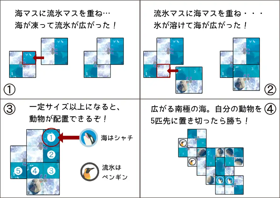 このゲームは、カードを重ねて流氷や海を広げ、その広さに応じて自チームの推し動物を配置します。
