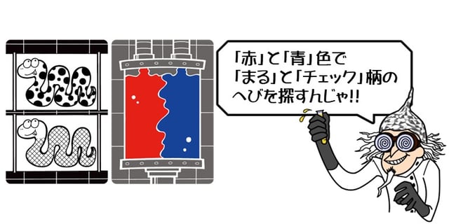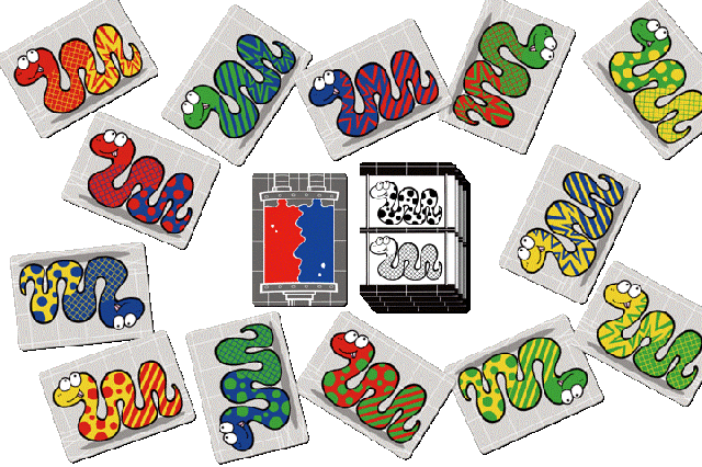 2つの色と2つの模様の組み合わさったヘビを急いで見つけるカルタ系ゲームです。