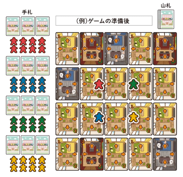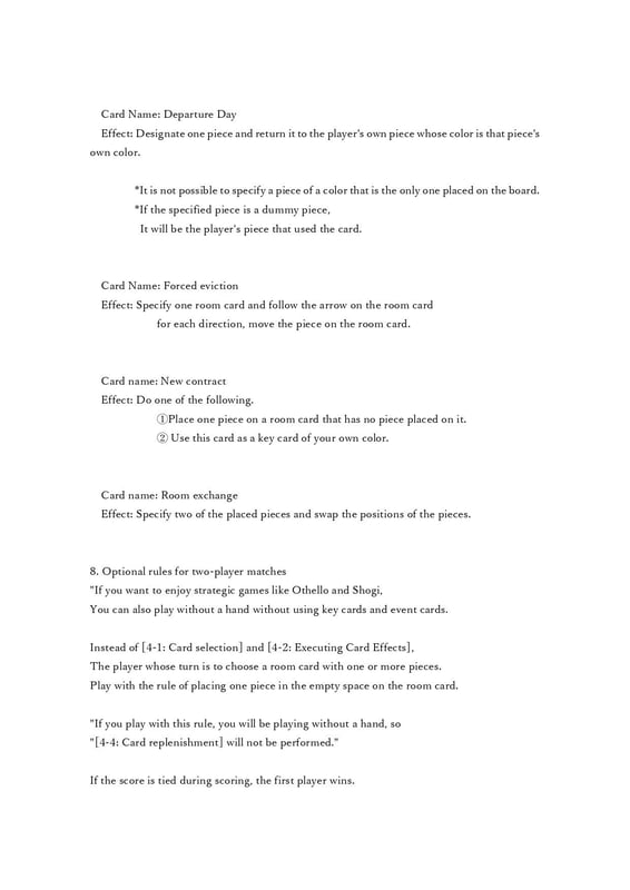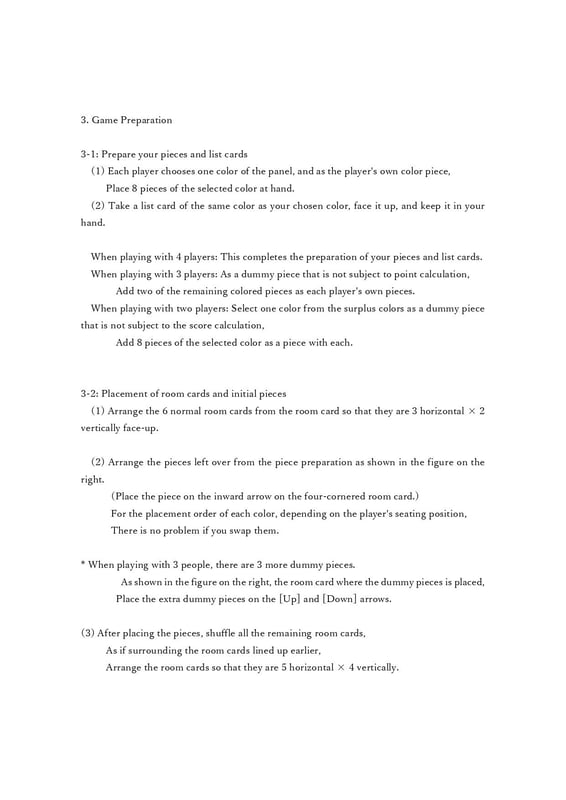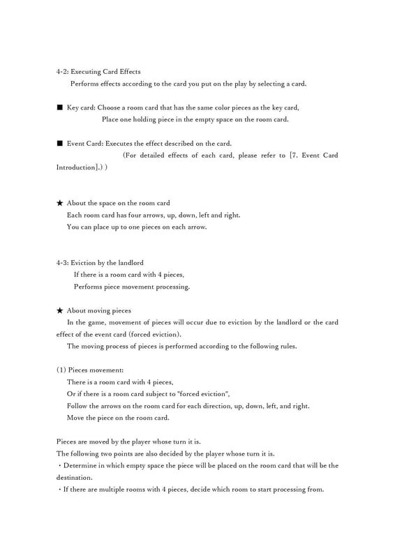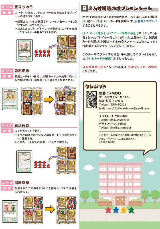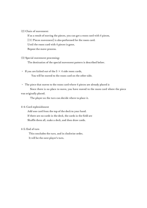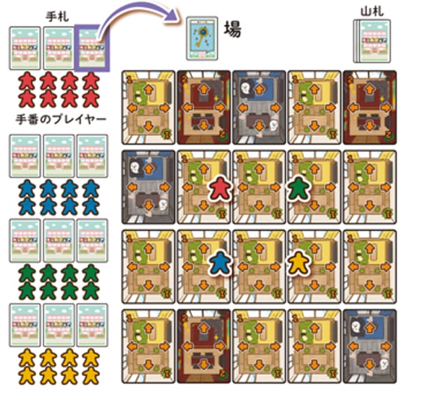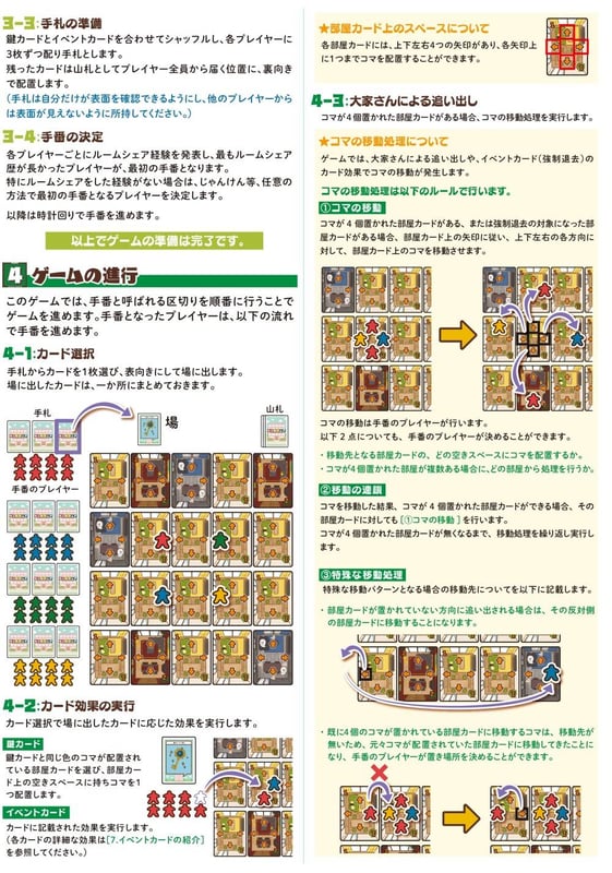 (移動先の部屋カード上のコマが4個になった場合は、続けてその部屋カード上のコマも同様に移動させます。[追い出しが連鎖します。])