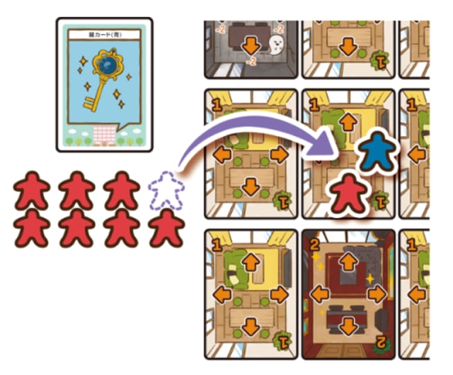 A.鍵カードの場合:鍵カードと同じ色のコマが配置されている部屋カードに、持ちコマを配置します。