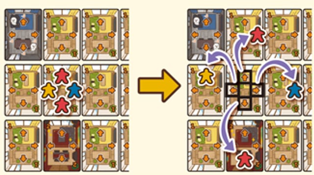 コマが4個置かれた部屋カードがある場合、部屋カードに描かれた矢印の方向にコマを移動します。