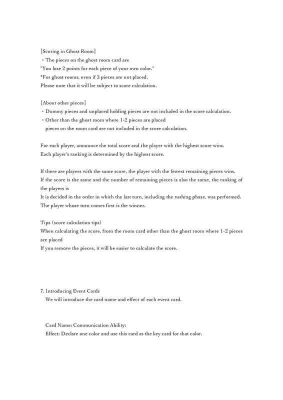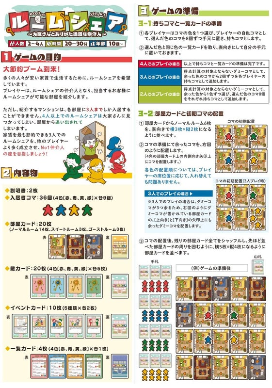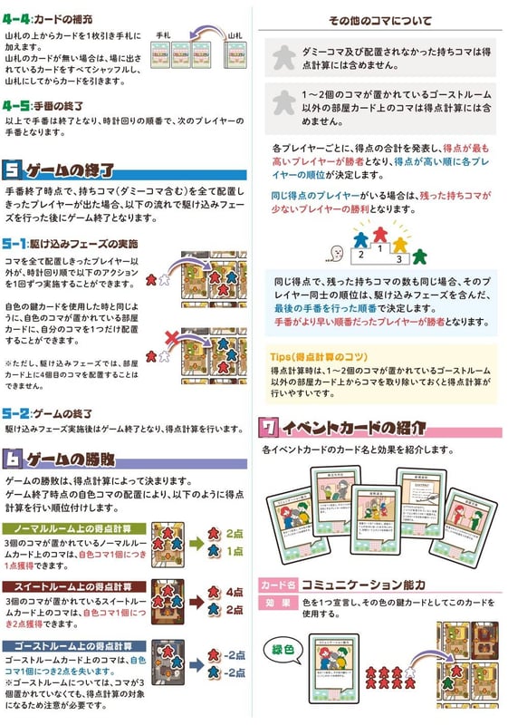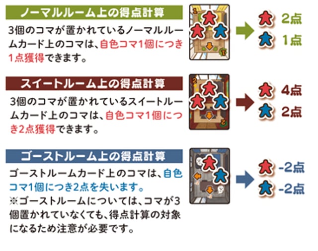 手札から場に出すカードの効果で、部屋カード上に持ちコマを配置していきます。ゲーム終了時点で、3人部屋に置かれているコマの数で得点計算を行い、得点の最も高いプレイヤーが勝者となります。