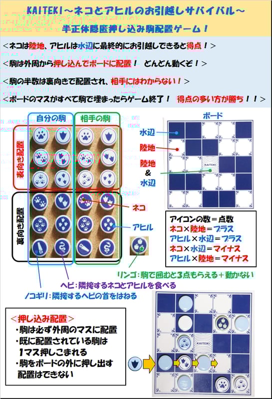 (最終的にネコ駒はボードの陸地マス、アヒル駒は水辺マスに置いてある状態を目指します。)