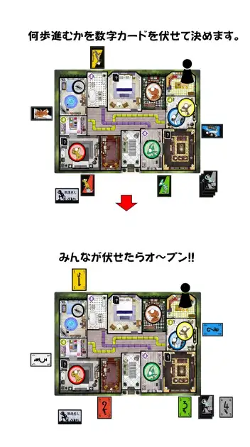 - 同時にセットする数字カードで進むすごろく。移動先の部屋で行われる数々のアクション!!