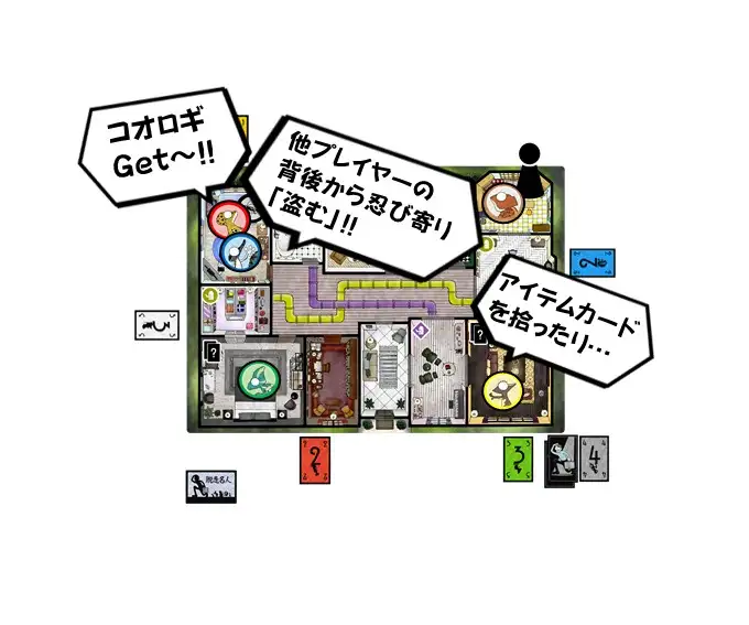 - 他プレイヤーのいる部屋に止まれたら「盗む」チャンス!!
