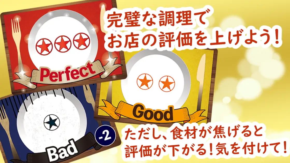 食材が焦げてしまうとBad評価になり減点となるので気を付けて?
