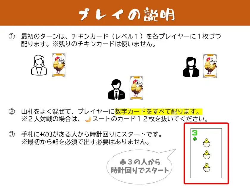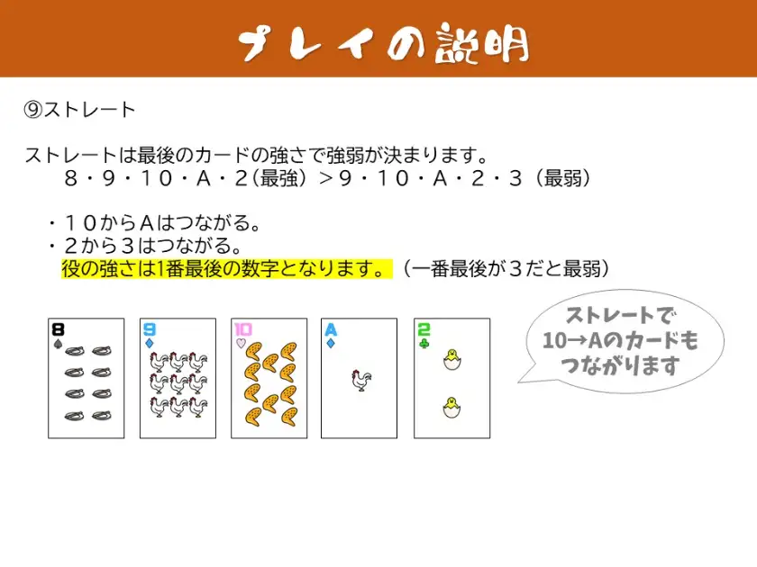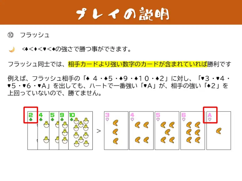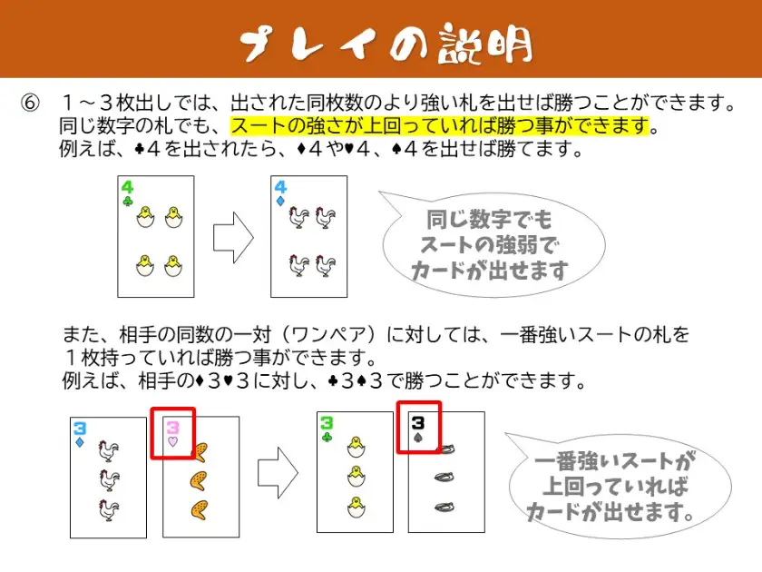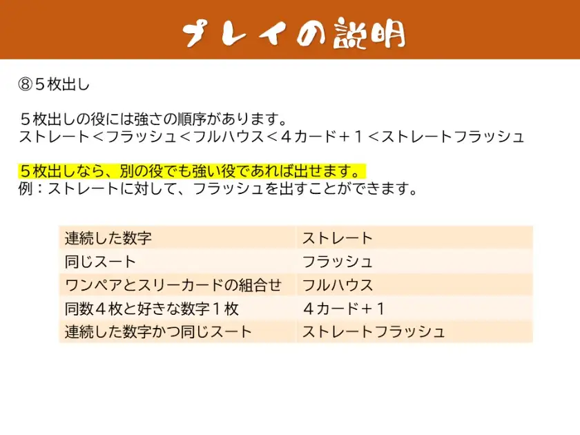 中華圏の大富豪(BIG2)で役が出しやすいようにアレンジ。大富豪ルールでカードは1枚出し、2枚(ペア)出し、3枚(スリーカード)出し、5枚(ポーカーの役)出しができます。