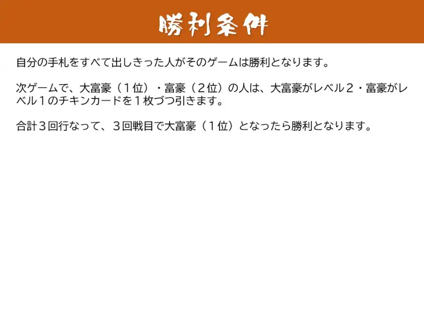 計3回戦で最後のゲームで大富豪となった人が勝利です。