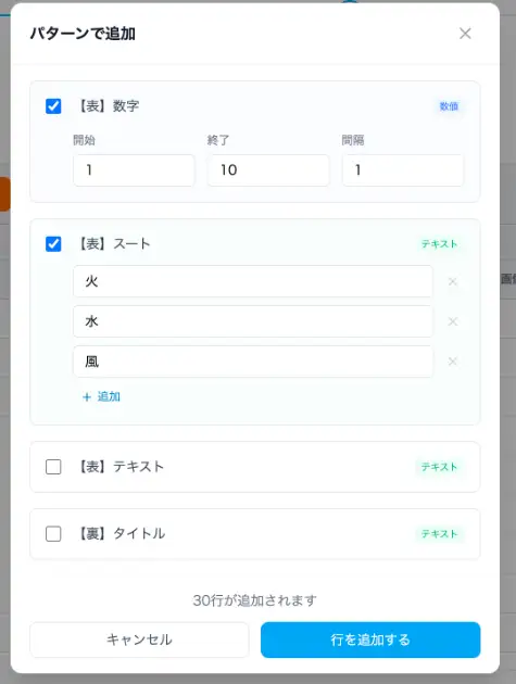 さらにパターン生成機能を使えば、数値の連番やテキストの組み合わせからカードデータを自動生成。たとえば「コスト1〜10 × 属性(火・水・風)」で30種類のカードデータが一瞬で作れます。