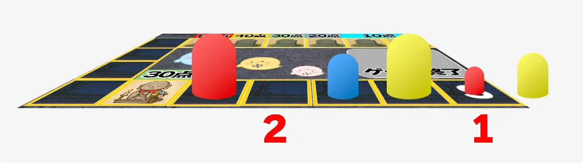 各プレイヤー、得点マスに止まっている自分のおばけコマの得点を合計して得点が最も高い人が勝者となります。