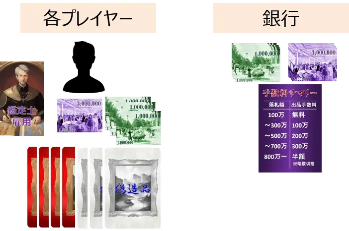 ・各プレイヤーに鑑定士雇用カードを1枚ずつ配ります。