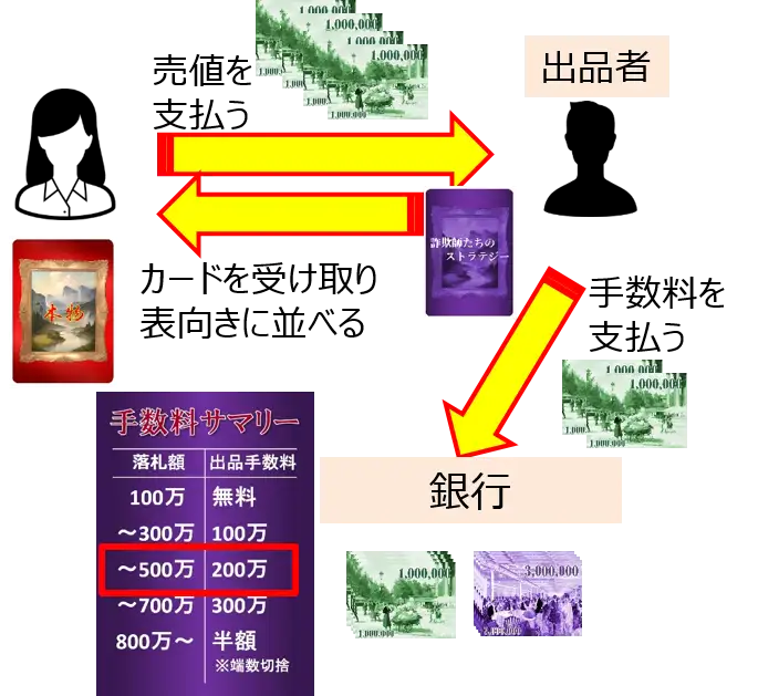 同時に、手番プレイヤーは『売値』に対応した出品手数料を銀行に支払います。