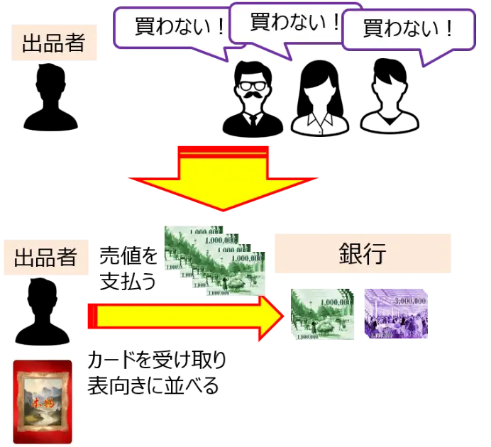 ただし、もし誰も買わなかった場合は、出品した手番プレイヤーが『売値』を銀行に支払ってそのカードを買い取らなければなりません。(この場合は手数料はかかりません)