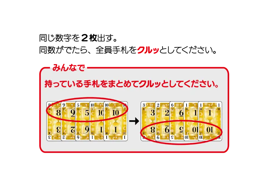 その一つは、同数2枚が場に出されたら【全員、手札をすべてクルっとしてください】