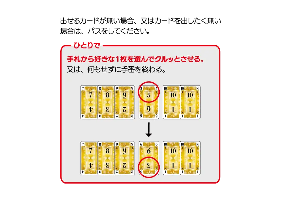 もう一つは、自分の手番でパスをすると【手札から1枚選んでクルっと出来る】ただし、しなくても良い。