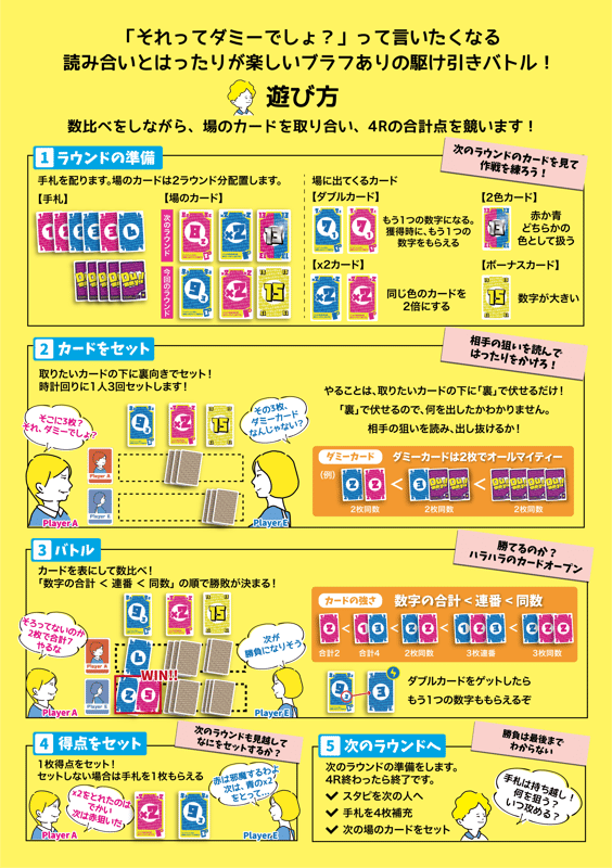 ダミーカードを巧みに使い、ブラフで場を操りながら、駆け引きをして盛り上がりましょう!